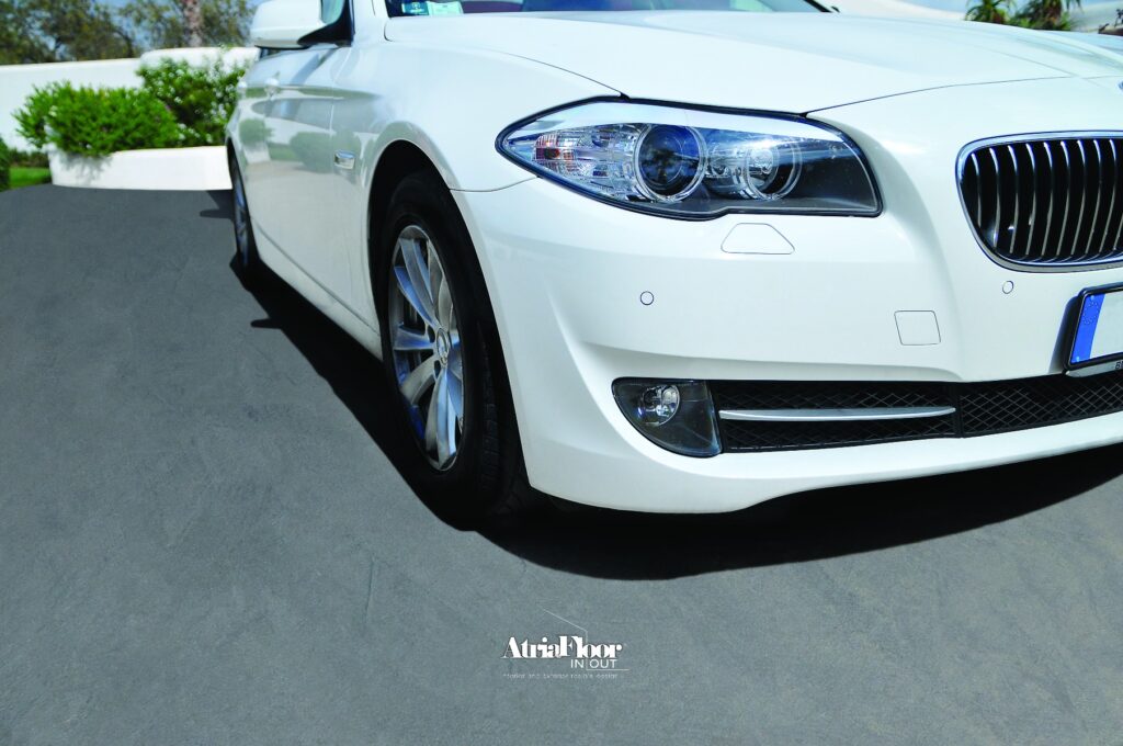 Atriafloor In/Out може да бъде полаган навън, защото не се влияе от климатичните промени и е изключително устойчив на механично натоварване – напр. ходене и преминаване на коли. В същото време запазва приятното усещане за домашна атмосфера, без да придава индустриален вид на повърхностите. Един продукт за вътре и вън – уникална концепция, която обединява модерен дизайн, гъвкавост и индивидуалност.