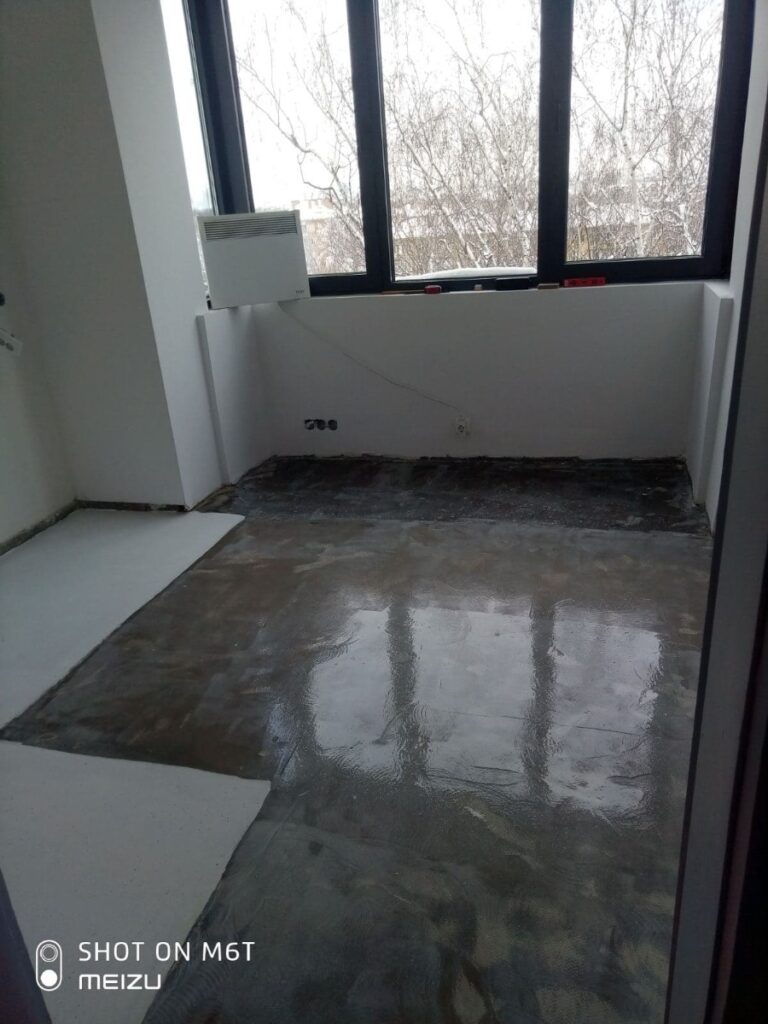 Следващият етап е да се изравни повърхността и да се елиминира разликата в нивата на старите подови настилки. За целта е положена 2 слоя изравнителна шпакловка Atriafloor Rasante One