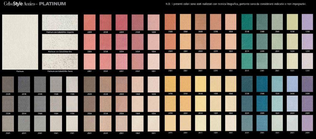 Cebo Style Antico Platinum (ЧебоСтил Антико Платинум) е декоративна боя с рустикален ефект с фини песъчинки и меки метални отблясъци и деликатни при докосване дълбоки цветове. Позволява да се постигне ефект на “движение” на цветовете, дължащ се на отразяването на светлината. Предлага се в 195 стандартни цвята.